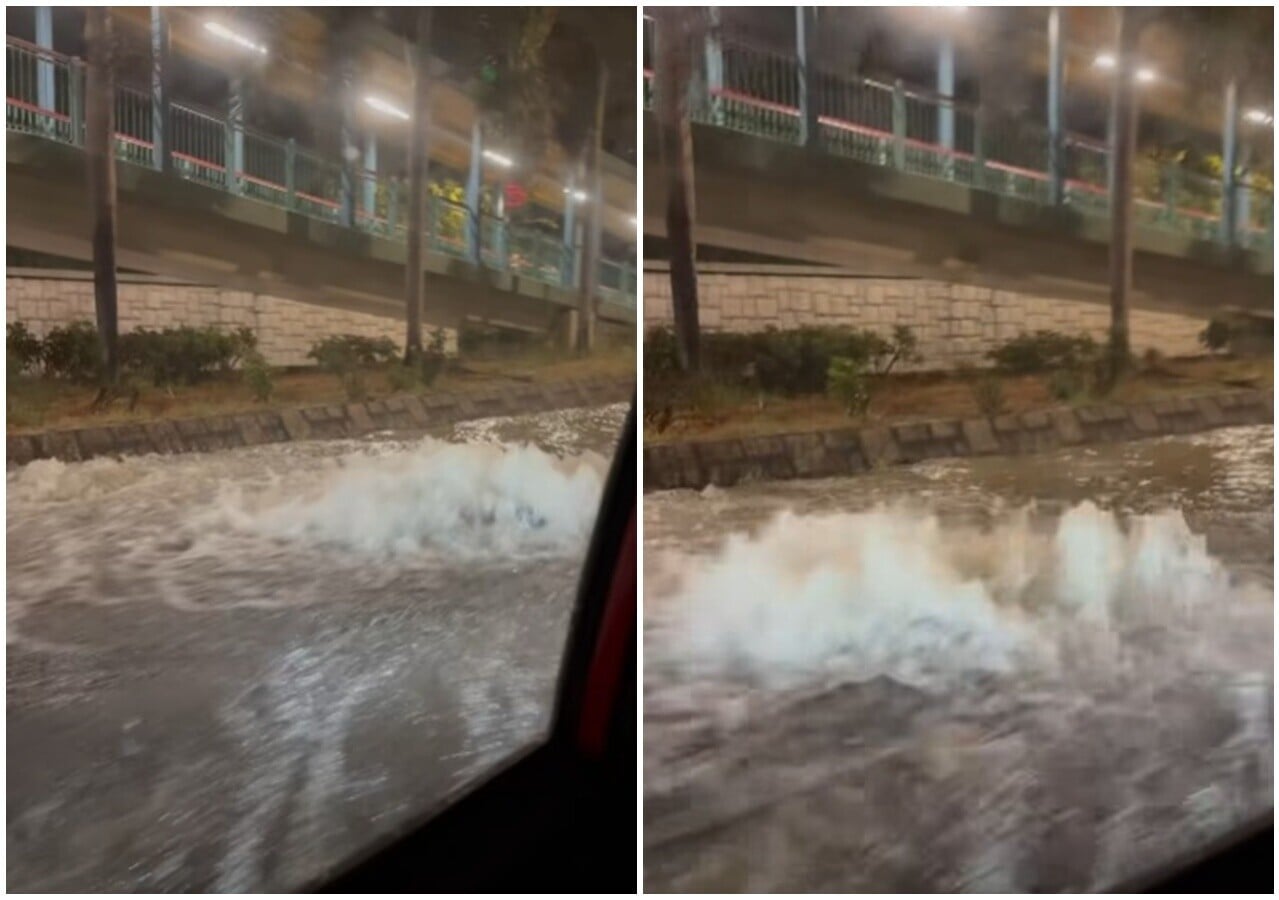 沙頭角公路爆水管,駛經車輛如陸上行舟。(FB/ 北區之友 Friends of North District)