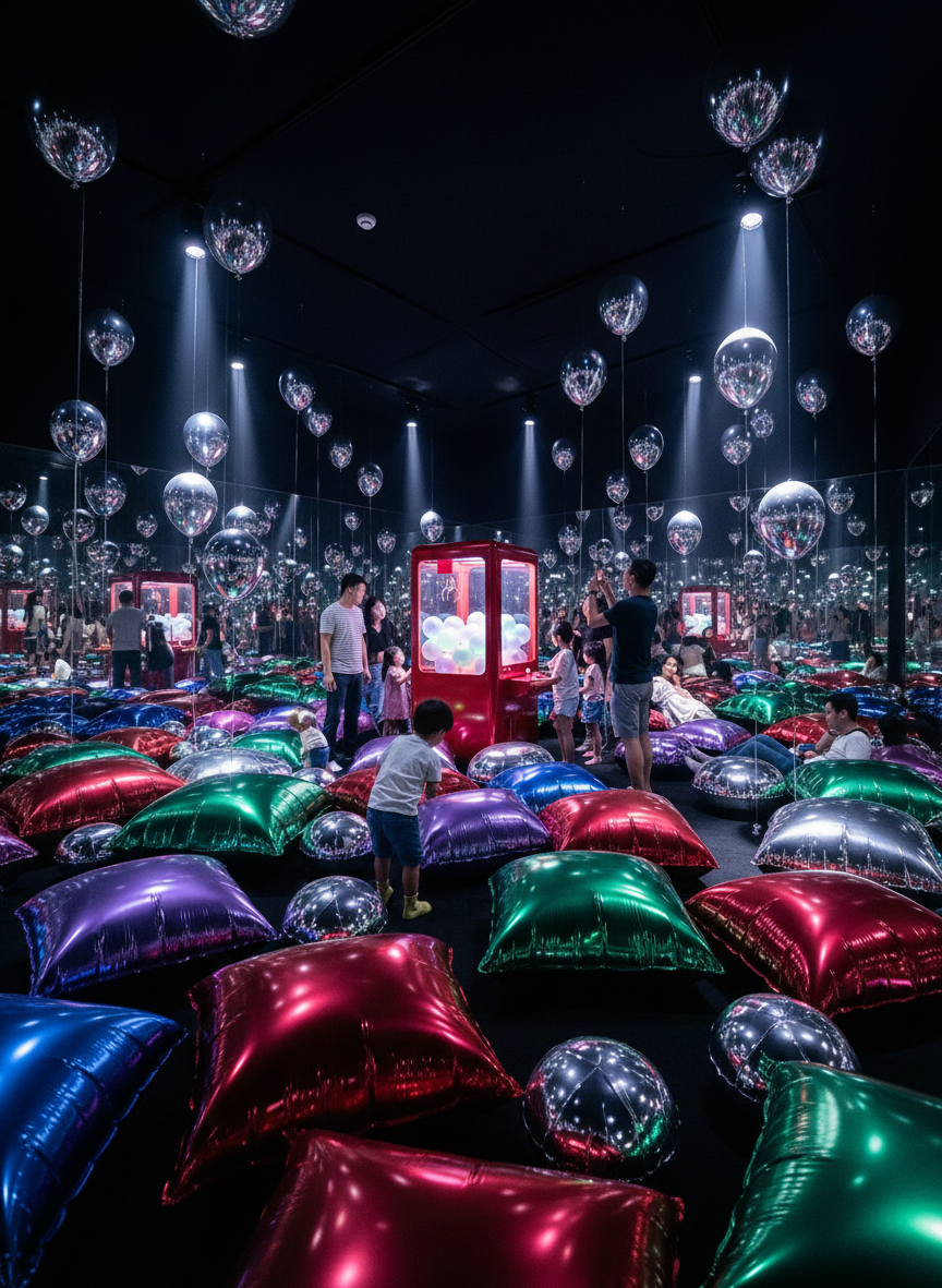 突破性的國際藝術流派煥新呈現「Pop It!」展廳的靈感源自新普普藝術,以不同大小的反光泡泡設計來點綴空間。訪客可從展廳中間的巨型夾公仔機取出可愛的「普普氣球狗啫喱」,為體驗增添驚喜。