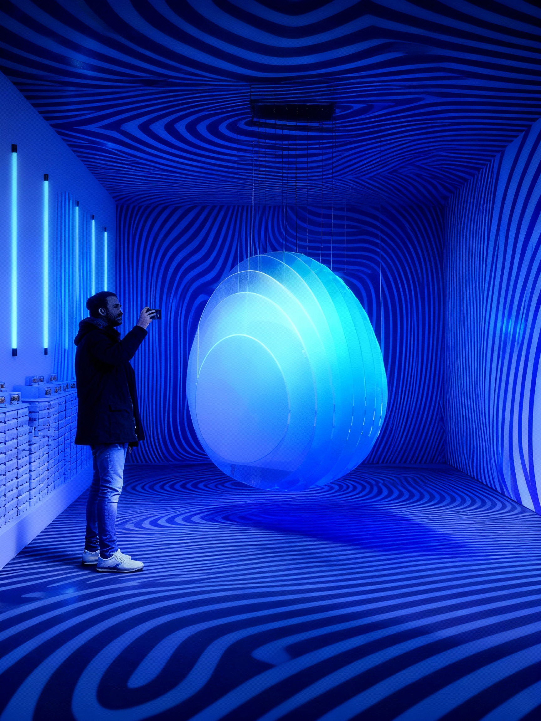 「Blue-tiful」展廳以錯位視覺為核心,巧妙演繹歐普藝術,透過雞蛋形態在沉浸式藍色光影中營造視覺錯覺,築構出完美的圓形意象。訪客在此展廳將獲得「歐普彩蛋」—一款由蛋漿製成的蛋形甜點,並放在經典的雞蛋盒中延續錯覺藝術的想像力,圓滿多重感官享受。