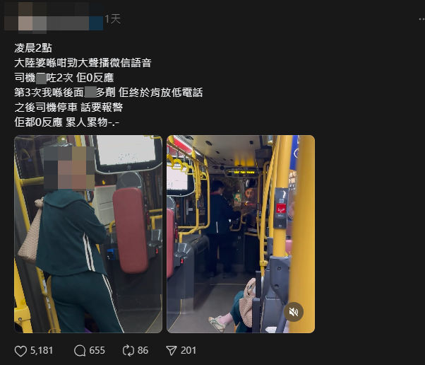 乘坐巴士時切勿騷擾司機駕駛。有乘客在周四(12日)在社交媒體上分享影片,指有女乘客乘搭九巴N373時,用手機大聲播放微信語音,司機多次勸止都沒有理會,最終司機報警處理。