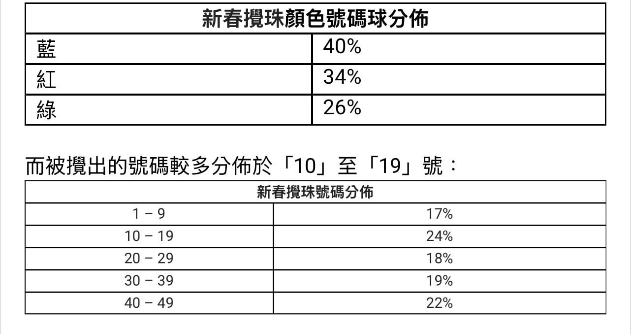 從六合彩自2002年7月增加至49個號碼至今,於新春首次攪珠共23次,當中「15」號開出次數最多,共7次;其次是「10」號、「36」號、「43」號及「48」號,均開出6次。