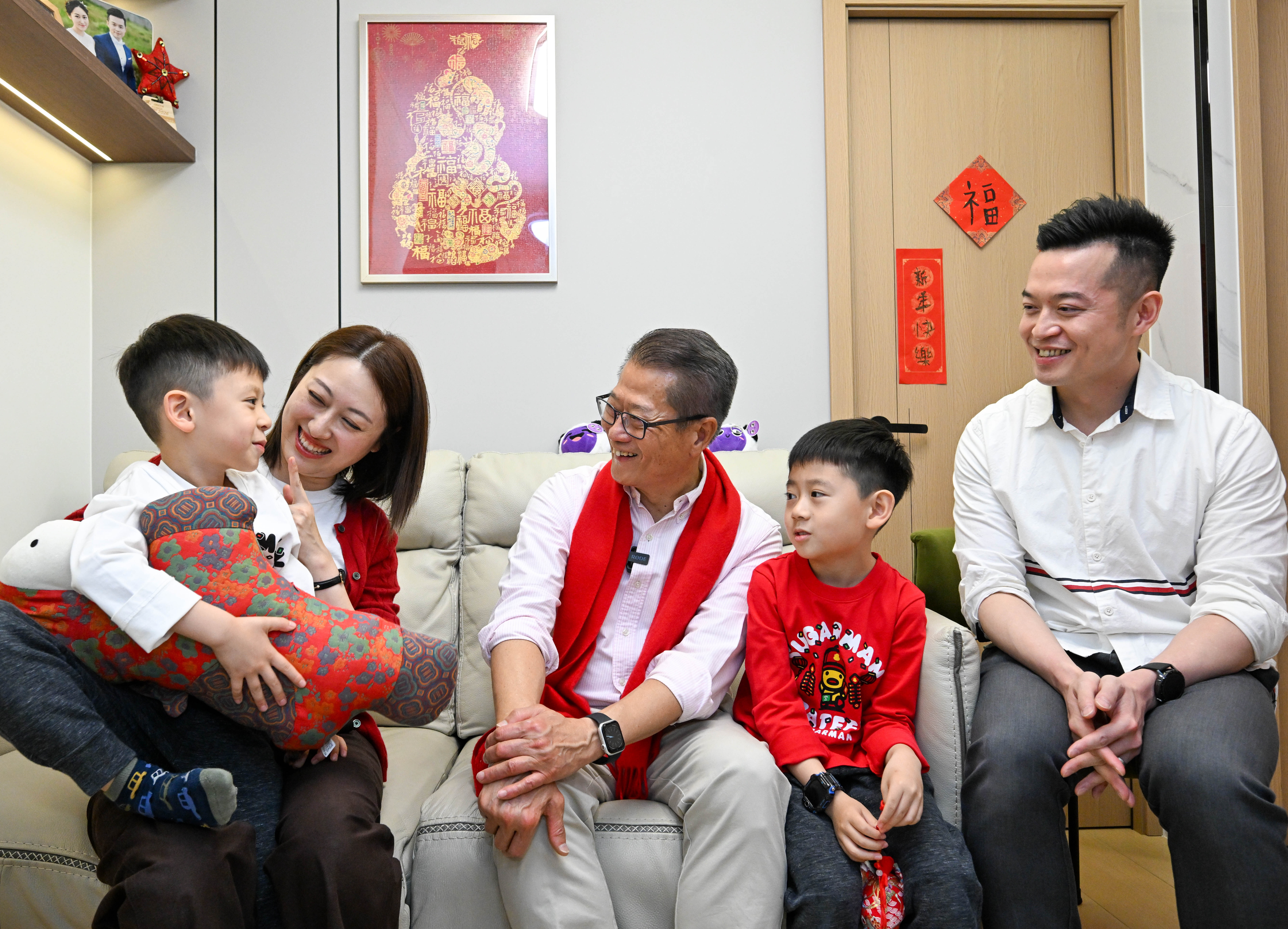 政府今日公布財政司司長陳茂波、政務司副司長卓永興、財政司副司長黃偉綸、財經事務及庫務局局長許正宇以及教育局局長蔡若蓮今日分別走訪中西區、沙田區、東區、九龍城區和深水埗區,探訪區內家庭。陳茂波在署理中西區民政事務專員周卓瑩陪同下,聯同中西區區議員和地區服務及關愛隊伍(關愛隊)代表探訪居於堅尼地城的年青家庭和長者家庭,了解他們的生活情況,並送贈賀年福袋,向市民表達問候,祝他們馬年心想事成。