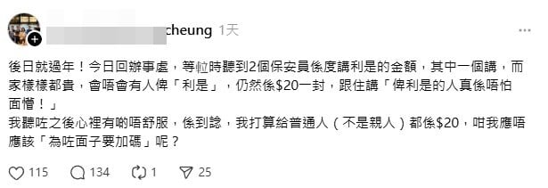 樓主周日(15)於社交平台Threads上分享見聞指,指日前等候升降機時,無意中聽到2名保安員正在討論利是金額,其中一人說,現時百物騰貴,猜想會否仍然有人只給20元一封的利是,接著嘲諷:「俾利是的人真係唔怕面懵!」樓主說聽後心裡有點「唔舒服」,因為他打算向一般非親人給20元利是,躊躇於應否「為咗面子要加碼」?