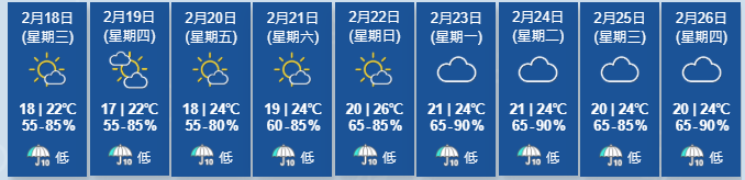 天文台展望,年初三早上清涼,風勢頗大,日間短暫時間有陽光。隨後兩三日日間溫暖。隨著季候風逐漸緩和,本周後期至周末期間廣東地區日間溫暖。預料一股偏東氣流會在下周初影響華南沿岸,該區雲量增多。