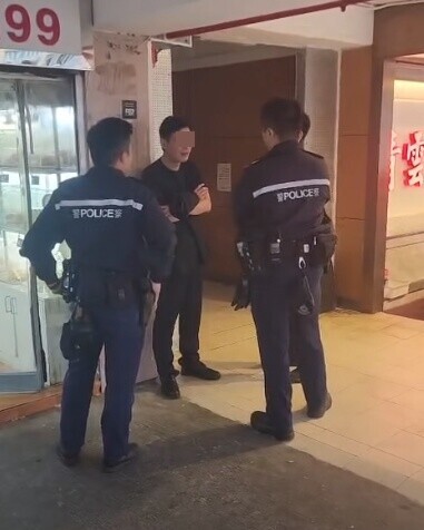 另一段長約2分鐘的影片顯示,一名手持黑外套的男子在店外被多名警員包圍。期間男警員高聲要求對方合作,並提醒在場人士「幫手影住」。男子交出身份證,並指警員「玩嘢」,一名警員大聲回應:「我𠵱家執法,唔係玩嘢……處理你」,黑衣男反駁:「我都處理你」,男警回應:「敢咪嚟囉,講無用㗎」,男子突然嘗試靠近警員對話,該名警員隨即警告:「如果你埋嚟掂到警察,拉你襲警,明唔明?」又提醒同袍:「唔使同佢咁多廢話。」