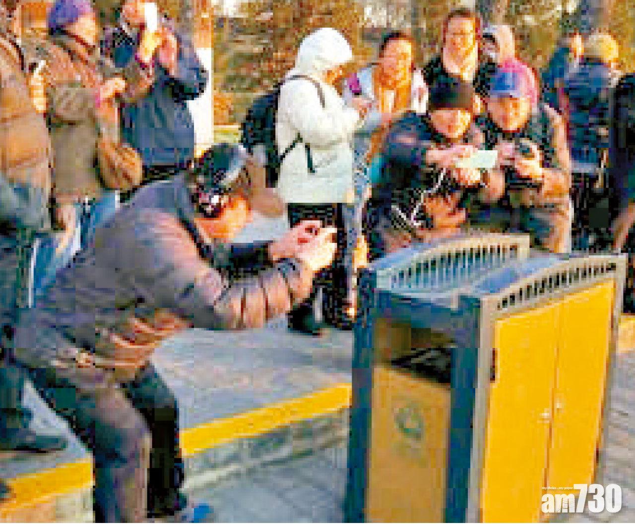 每年冬至前後,北京頤和園的十七孔橋都會在夕陽照射下呈現「金光穿孔」美景,吸引無數遊客及攝影愛好者前往拍攝,而日前有上千人去到湖邊「爭影相」,據報有人為拍得美照,提早8小時到場「霸位」,佔不到有利位置的遊客退而求其次,圍著園內「同款」垃圾桶拍攝「高仿美景」(圖1及2),許多遊客發現這一「捷徑」後紛紛仿傚。