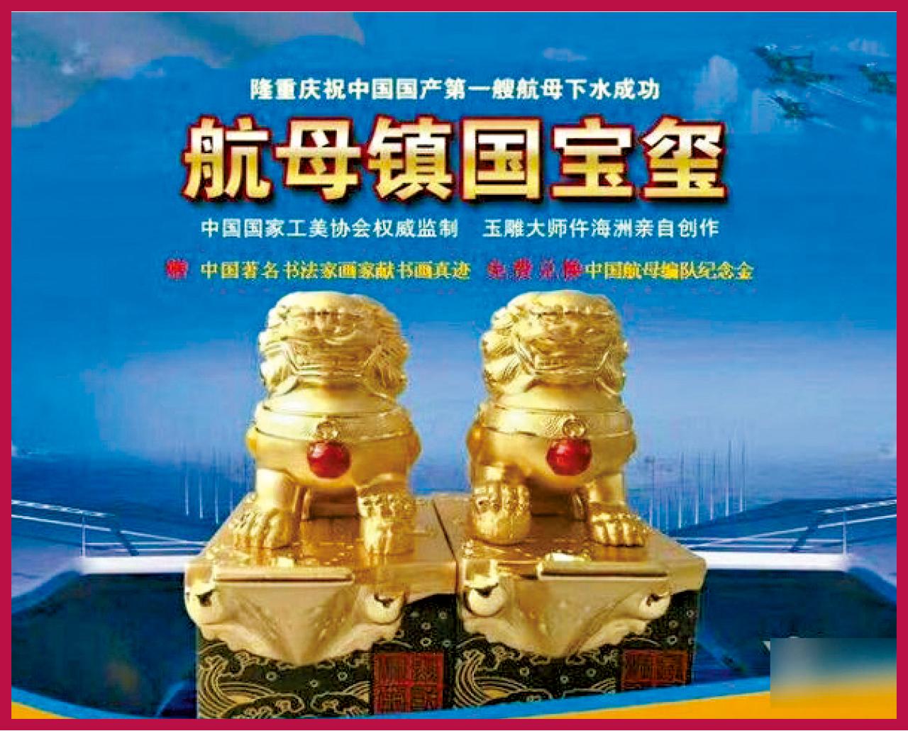內地又有騙徒藉紀念航母下水推出「紀念品」騙財,《環球時報》旗下微信公眾號「耿直哥」指,湖北衛視及河北衛視近日出現長達30分鐘的「航母鎮國寶璽」(圖)電視購物廣告,打著「國家工美官方監製」、「上級單位批准」及「軍隊血統」等旗號吸引觀眾購買,惟實際與中國國家工美協會無任何關係,質疑省級衛星電視台事前竟不審核查證,「看來廣電總局又要有得忙了」。
