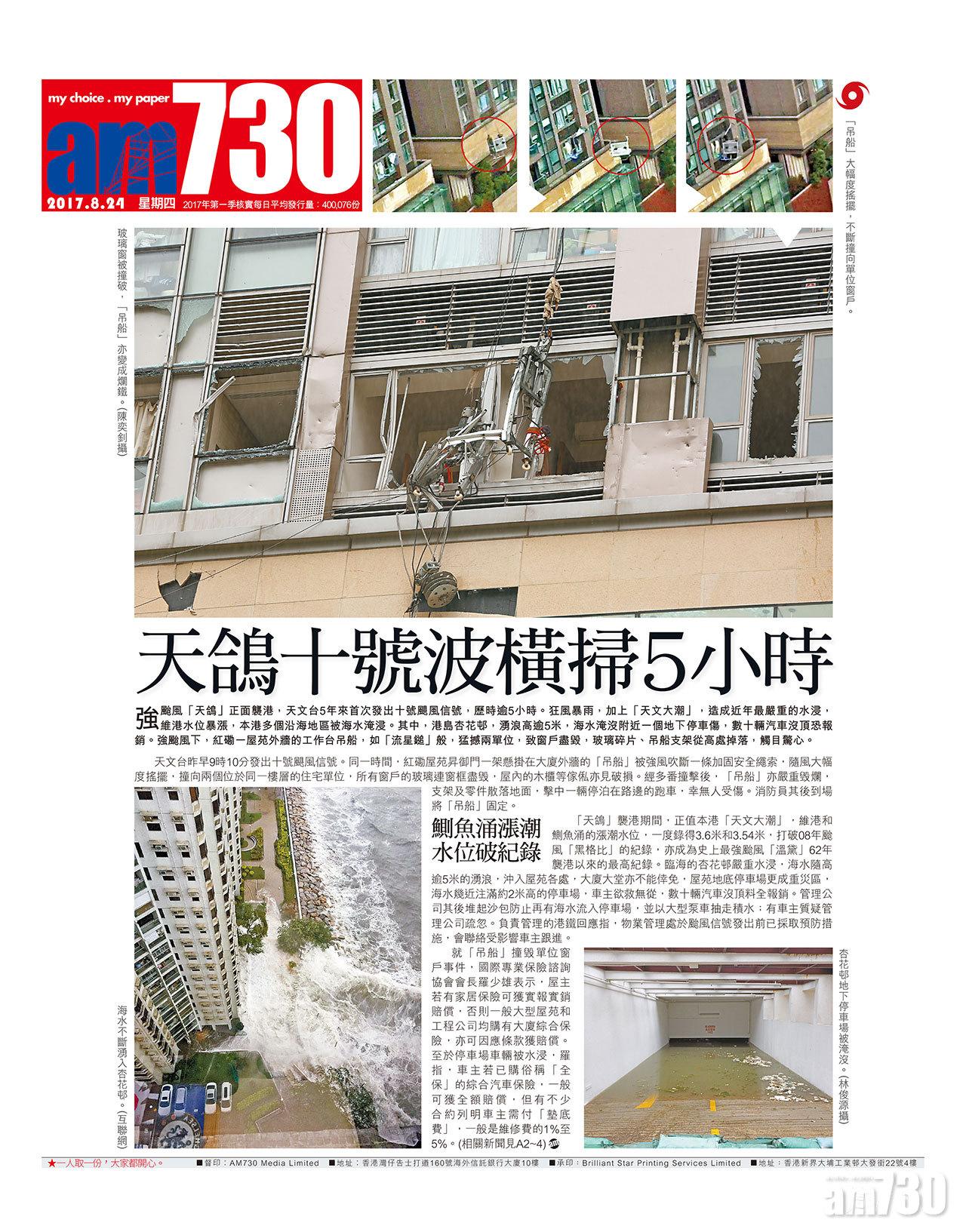 強颱風「天鴿」正面襲港,天文台5年來首次發出十號颶風信號,歷時逾5小時。狂風暴雨,加上「天文大潮」,造成近年最嚴重的水浸,維港水位暴漲,本港多個沿海地區被海水淹浸。其中,港島杏花邨,湧浪高逾5米,海水淹沒附近一個地下停車傷,數十輛汽車沒頂恐報銷。強颱風下,紅磡一屋苑外牆的工作台吊船,如「流星鎚」般,猛撼兩單位,致窗戶盡毀,玻璃碎片、吊船支架從高處掉落,觸目驚心。