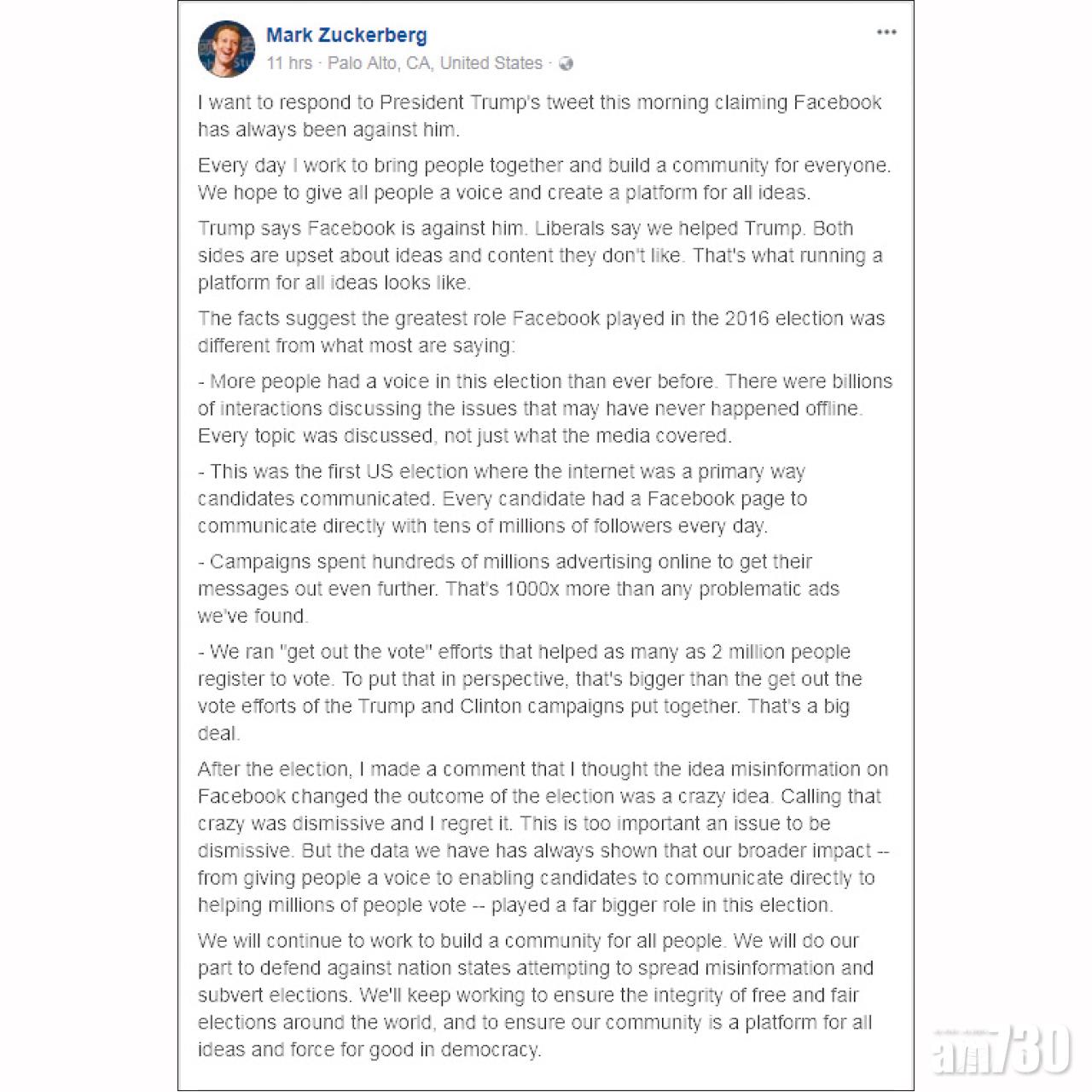 近日在Twitter周圍辣火頭的美國總統特朗普,最新目標是捲入俄羅斯干預美國大選調查的Facebook,周三清晨6時半貼文斥「Facebook經常反特朗普(anti-Trump)」,又暗示FB與假新聞傳媒串謀抹黑他。FB創辦人朱克伯格迅速發長文回應特朗普的「挑釁」,指特朗普說FB反對他,自由派則說FB支持他,雙方都不滿他們不喜歡的意見和內容,這正是FB所希望的,建立一個包容不同意見的平台。