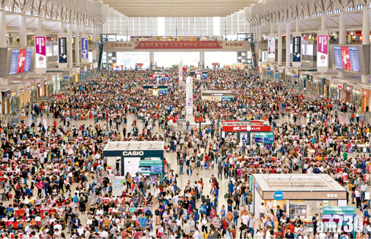 內地國慶中秋長假昨完結,全國共接待7.05億人次本地遊客,按年增11.9%。回家人潮昨湧現各地車站及機場,中國鐵路總公司指,全國鐵路昨增開920班列車,預計搭載旅客達1,400萬人次。圖為上海虹橋站。(新華社)