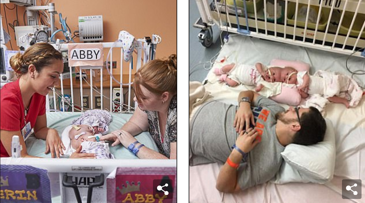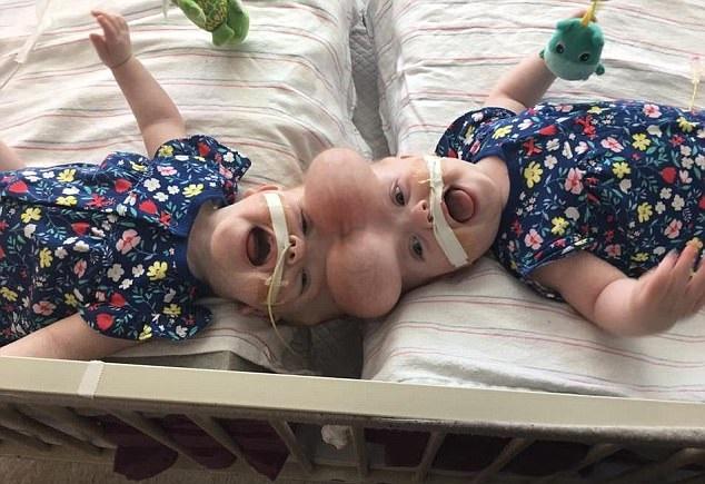 美國連頭B女Erin與Abby Delaney在周歲前夕收到生日大禮,費城兒童醫院30人團隊上周進行11小時分割手術,姊妹平安。手術前笑逐顏開的雙生兒,額頭脹鼓鼓皆因植入氣球撐大皮膚,以供分割後覆蓋頭部。