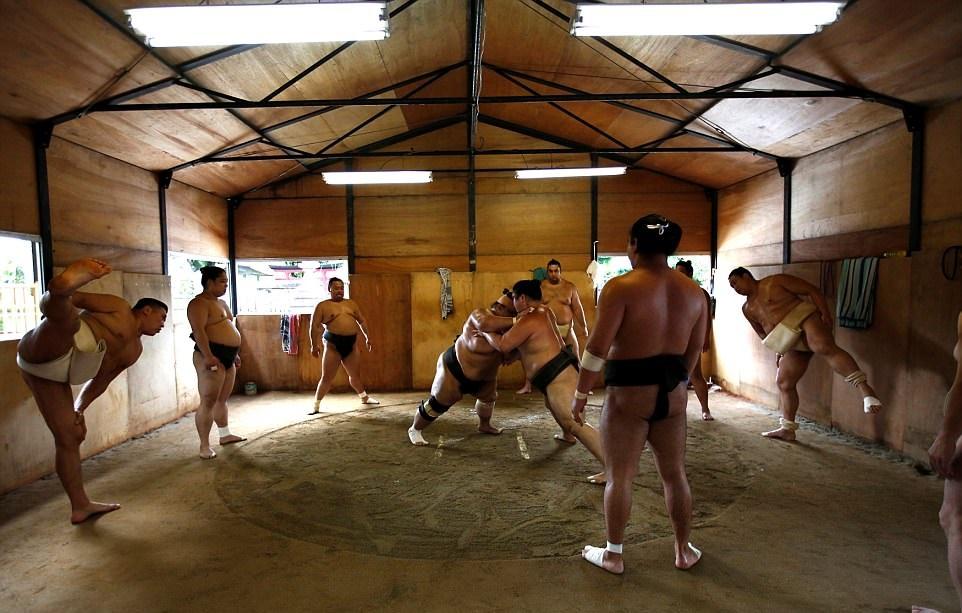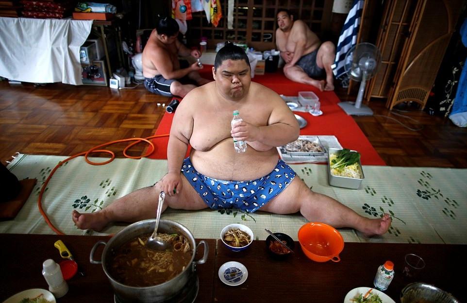 路透攝製隊直探名古屋八幡道寺院內的友綱部屋訓練營,11名巨人剛完成數小時操練,是開餐時間,各人每天須鯨吞8,000卡熱量(常人的4倍),看得記者胃部翻騰,定過神來又是幕幕驚心:午睡時間,加大碼榻榻米上的睡寶寶齊齊戴上止氣壓呼吸機,場面壯觀!沒有這個保命罩,誰擔保巨人不會一覺不醒。