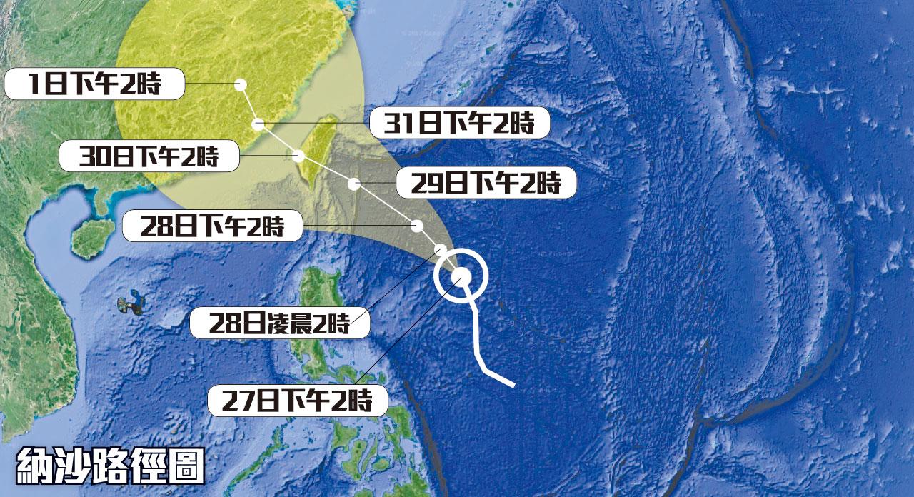 遊台注意!強烈熱帶風暴「納沙」(台譯「尼莎」)逐步迫近台灣,且有增強趨勢,按目前預測移動路徑估計,恐為一個「穿心颱」,料明日在花蓮至台東一帶登陸,穿越台灣出海,再移往廣東至福建一帶。台灣的中央氣象局表示,最快今日發出颱風海上及陸上警報,但可能仍有變數。