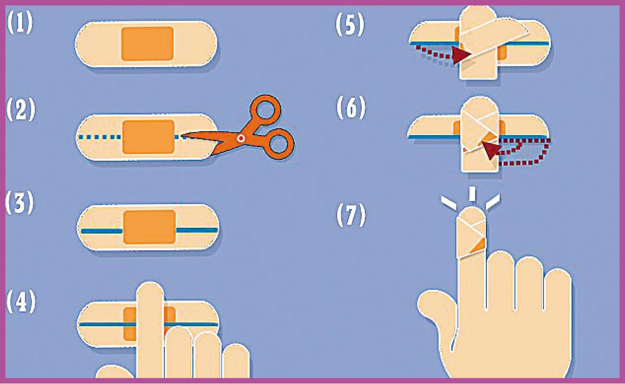 日本人善玩膠布圖案花口臣,Twitter用戶@ponzuyo則對包紮更具心得,譬如經常甩離的手指傷口膠布,他以圖表清晰指點:在兩端剪開,即宛如4條好使好用的小繃帶,傷口便包得完美貼服,水泡打風也難甩脫。