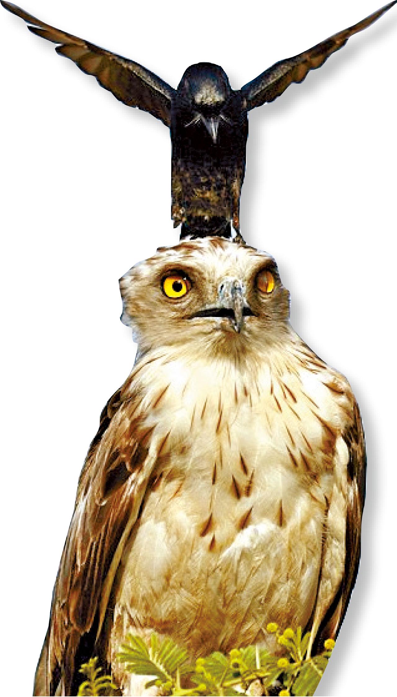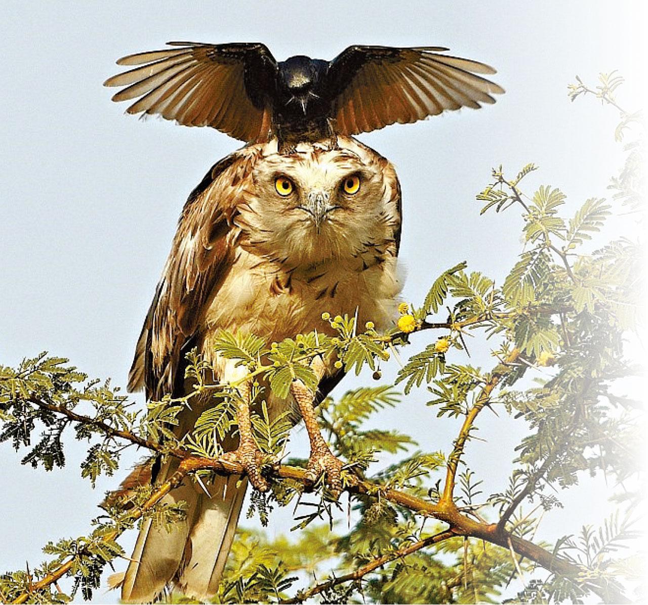 弱肉強食雖是森林定律,負隅頑抗亦是弱者常展現的非凡勇氣。業餘攝影師Greaves Henriksen在印度拍下的動物世界紛爭,有趣且饒富意義:一隻烏鴉竟挑戰樹頂老鷹,在牠頭上盤旋打轉作勢裝腔,繼而無懼利爪銳喙,空降於猛禽頭頂;所向無敵的老鷹為之錯愕疑惑,尊嚴受損亦未及反應。明踩強敵後,烏鴉收兵飛離,Henriksen估計牠只是暫且休戰,稍後必重返捍衛家園──地盤遭老鷹踩場,勇鴉誓不低頭!(互聯網)