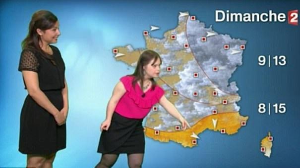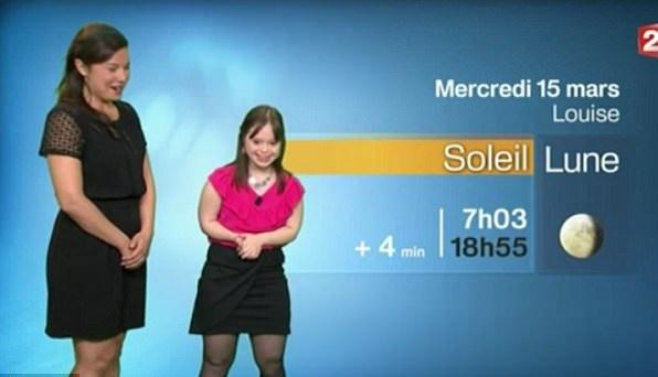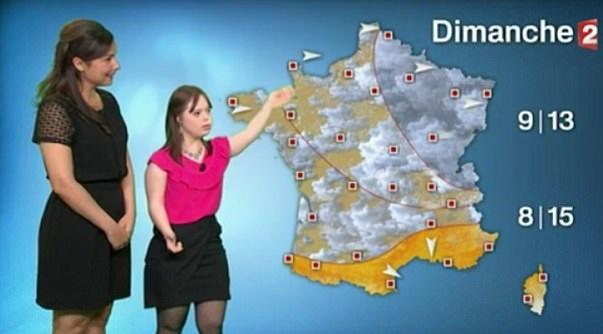 今天應該很和暖!法國國營電視台周二晚新聞時段邀來特別嘉賓報告天氣:唐氏症少女Melanie Segard。莫說廣播技巧,讀寫也不濟的她,偏有個當天氣女郎的心願;她在慈善機構協助下為夢想踏出第一步,上月向電視台挑戰,若發起的「Melanie做得到」行動在Facebook獲10萬like,電視台便讓她客串報告天氣。