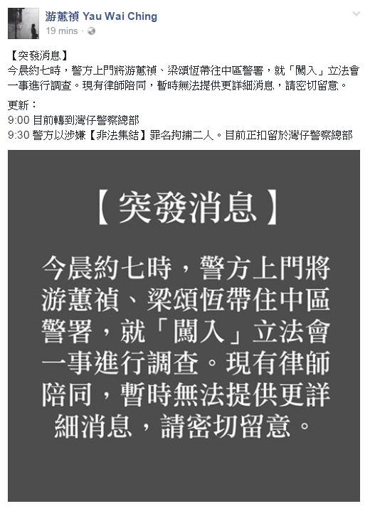 返回 本地 出版:2017-Apr-26 09:52 更新:2017-Apr-26 09:52 梁頌恒游蕙禎今晨被警員上門拘捕 涉闖立會會議廳 分享: 青年新政於社交網站貼文表示,今早7時許收到梁頌恆及游蕙禎的訊息,指2人分別被警方上門拘捕。現時2人被拘留在灣仔警察總部,已安排律師協助。據報就2人涉嫌非法集結闖入立法會會議廳事件進行調查。 游蕙禎在社交網站表示,警方是就「闖入」立法會一事進行調查。 ADVERTISEMENT送BOC Pay+ X M&M'S 慶新年開運箱