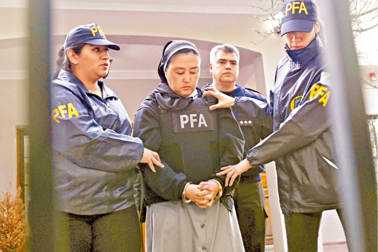 阿根廷西北部曼多薩省一間天主教聽障兒童學校去年爆出性侵案,2名神父及3名男職員被捕候判,其後有事主爆出42歲日裔修女小坂久美子(音譯)曾叫她穿尿布掩飾出血,涉共謀的小坂久美子匿逃1個月後,上周四終自首(圖),但在庭上否認控罪。(美聯社)