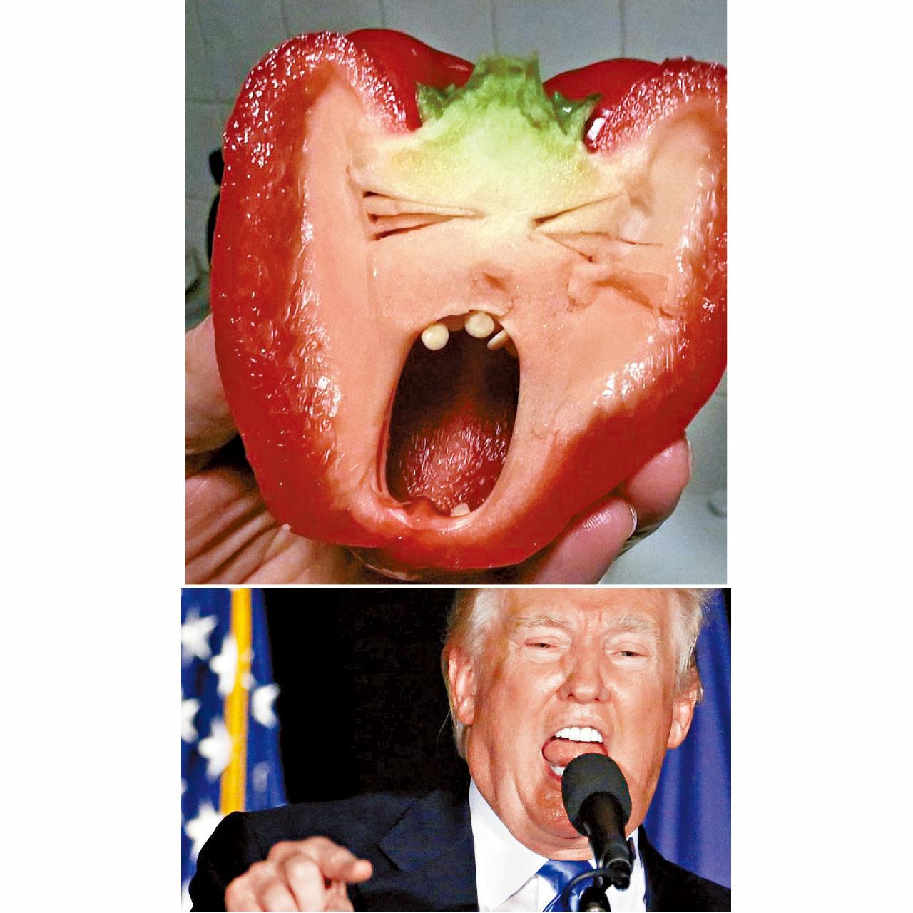 返回 本地 出版:2016-Dec-08 22:00 更新:2016-Dec-08 22:00 特朗普噩夢 分享: 西方仍受特朗普陰霾籠罩,半纏繞半發洩之下,眼前事物難免浮想聯翩。英女Janet Ayers下廚切開紅椒,驚見特朗普演講時的激動臉孔:椒蒂像亂髮、大窿似咀巴、種子是棚牙。真要對她的想像力給讚。(互聯網) ADVERTISEMENT送BOC Pay+ X M&M'S 慶新年開運箱