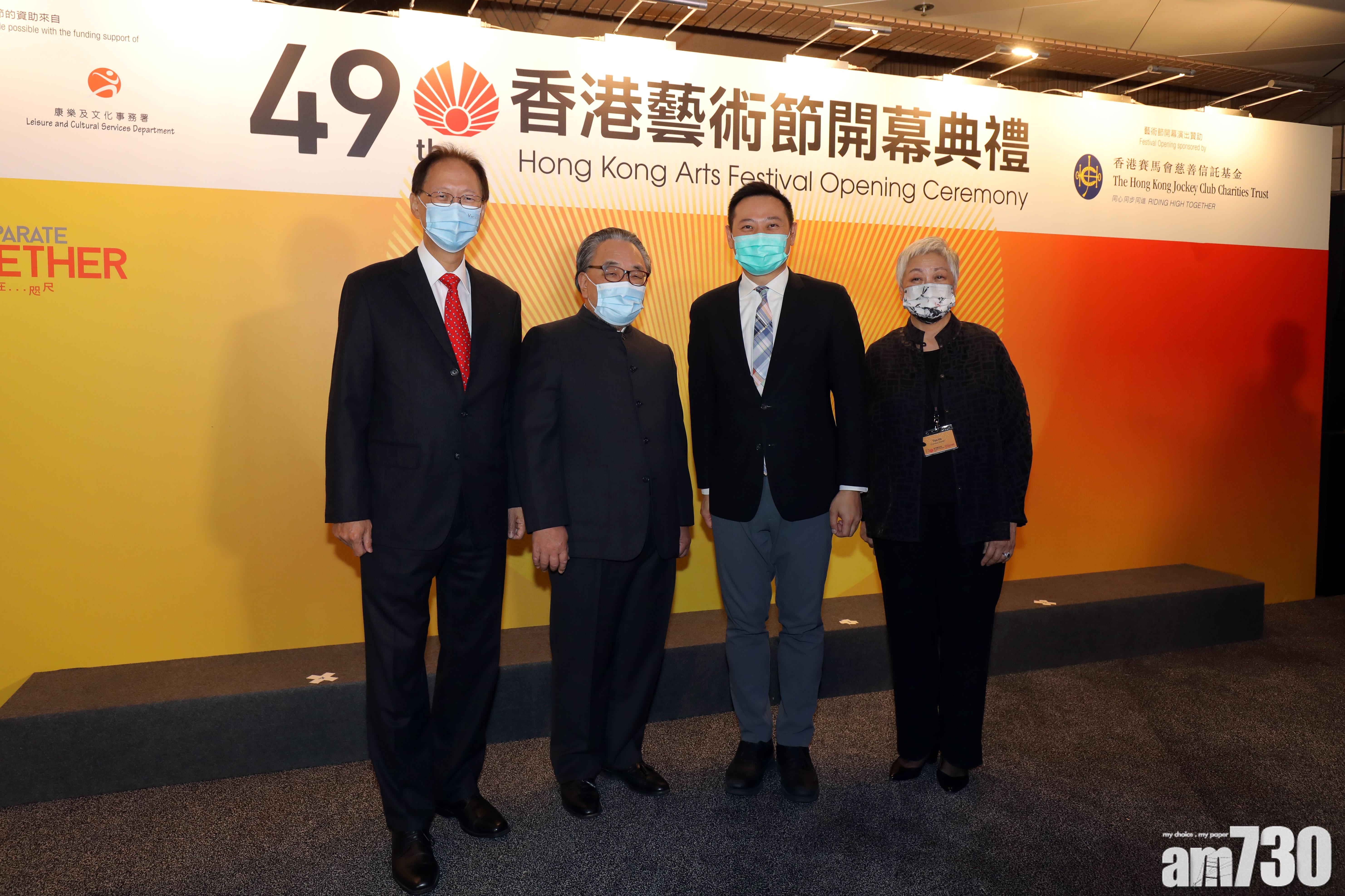 馬會主席陳南祿(左一)、民政事務局局長徐英偉(右二)、香港藝術節主席查懋成(左二)與行政總監何嘉坤(右一)出席香港藝術節開幕禮。