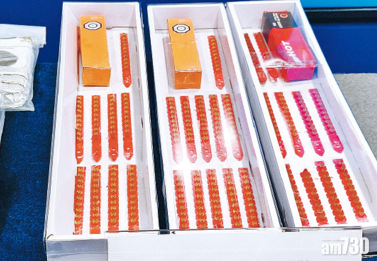 七一前夕,警方接獲線報,指有人利用五金舖買得的材料,製作炸藥及仿製槍械,並在網上揚言要「血洗」某些地方和殺死某些名人。有組織罪案及三合會調查科(俗稱「O記」)昨早採取行動,分別在藍田及大埔拘捕兩名男子,起獲7包共1.5公斤爆炸品原材料,初步確認是硝酸鉀、硫磺和糖漿;另有包含火藥的580發石屎釘槍彈、槍管及扳機等懷疑槍械部件、5支仿製槍械以及製作槍械的草圖等。警方相信檢獲到的材料可以製成1至1.5公斤的黑炸藥。