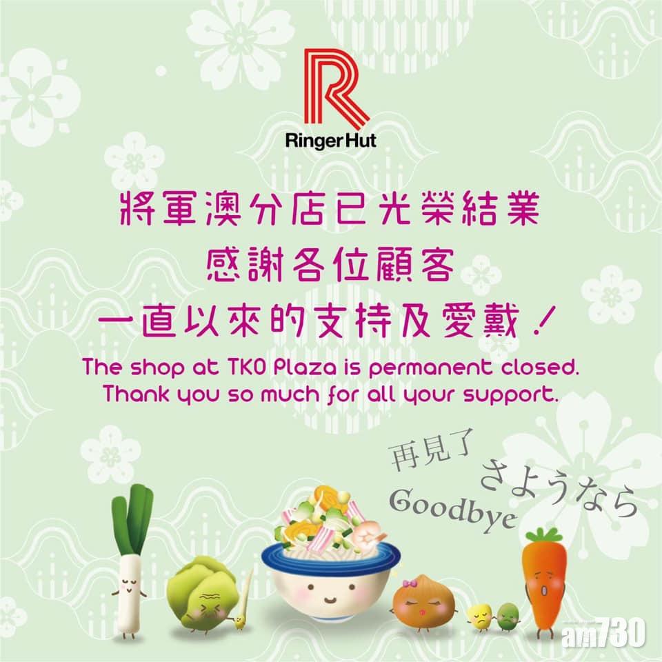 稻香集團旗下長崎拉麵店Ringer Hut今日在社交體專頁宣布,將軍澳Ringer Hut分店已結業,意味著Ringer Hut全面撤出香港市場。而在稻香官網上,已刪除Ringer Hut的品牌及分店資料。