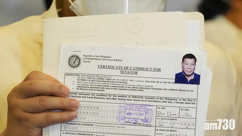 杜特爾特早前表明任期結束後將退出政壇,其後角逐明年的參議員選舉,日前已派代表提交了參選參議員的表格。