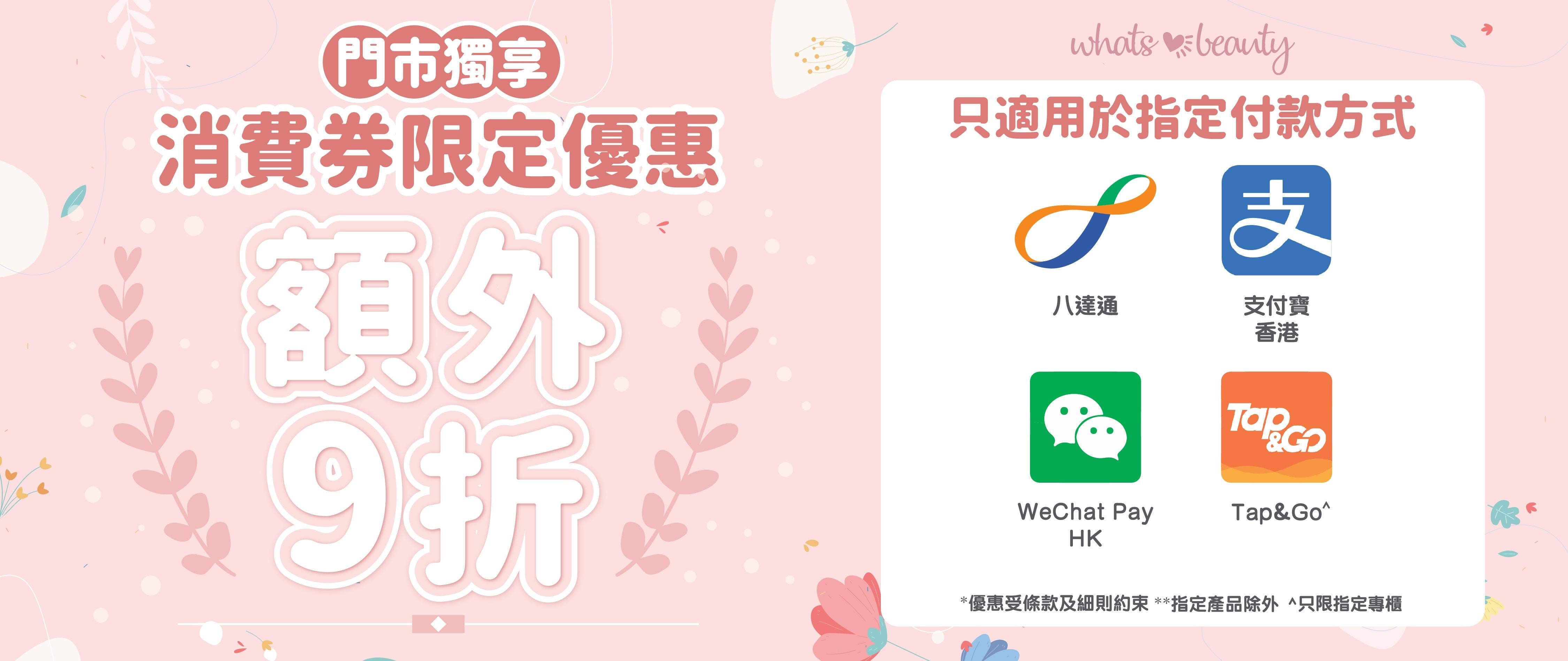 優惠:消費劵購物優惠額外9折,可使用AlipayHK 及#Tap&Go。