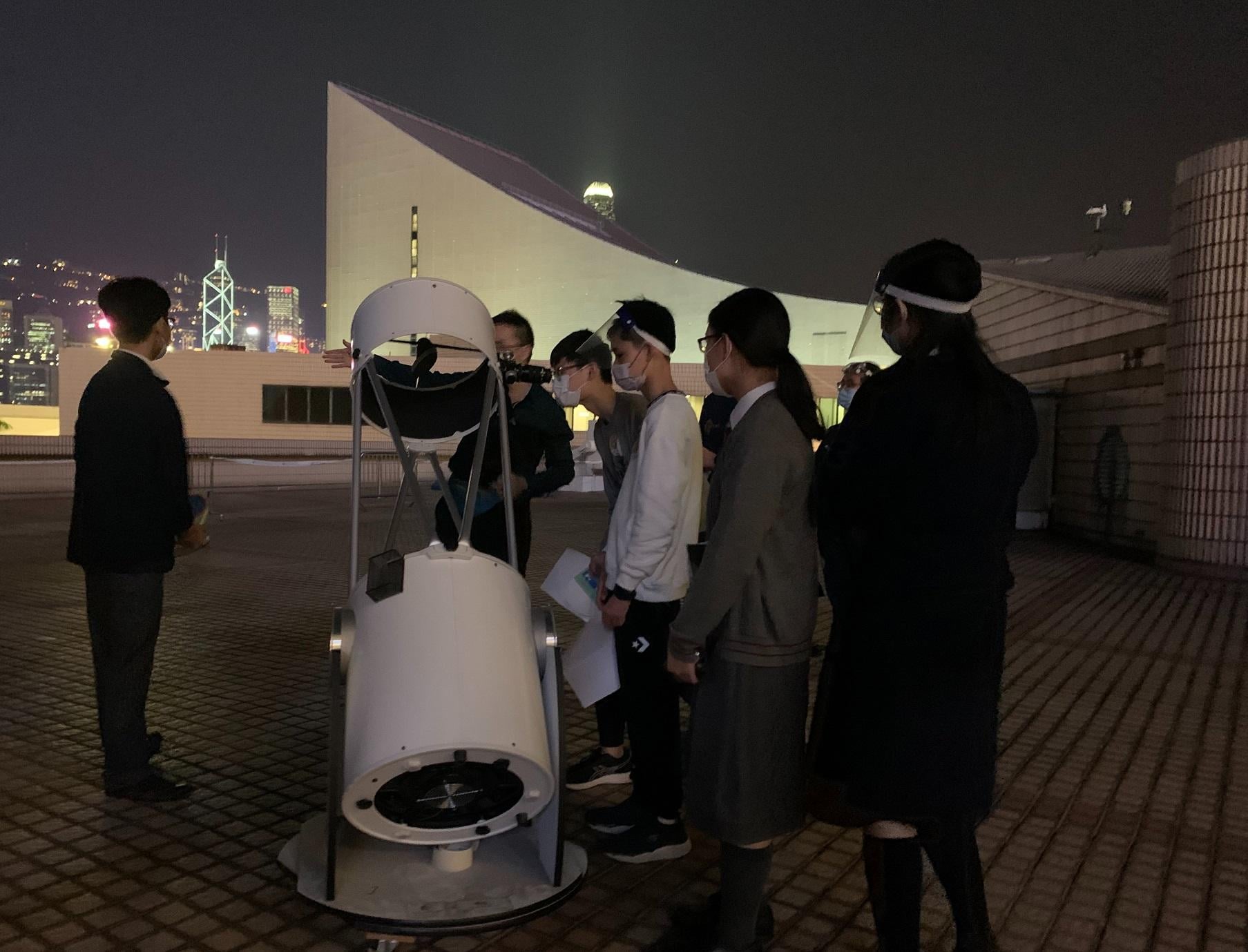 中天訓的學員在太空館天台以天文望遠鏡觀星。