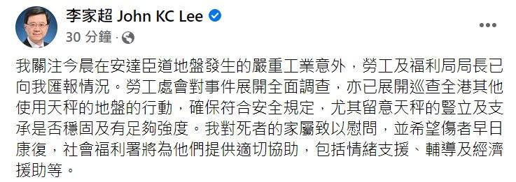 特首李家超稱向意外中死者的家屬致以慰問,表示勞工處會展開全面調查。(李家超fb截圖)
