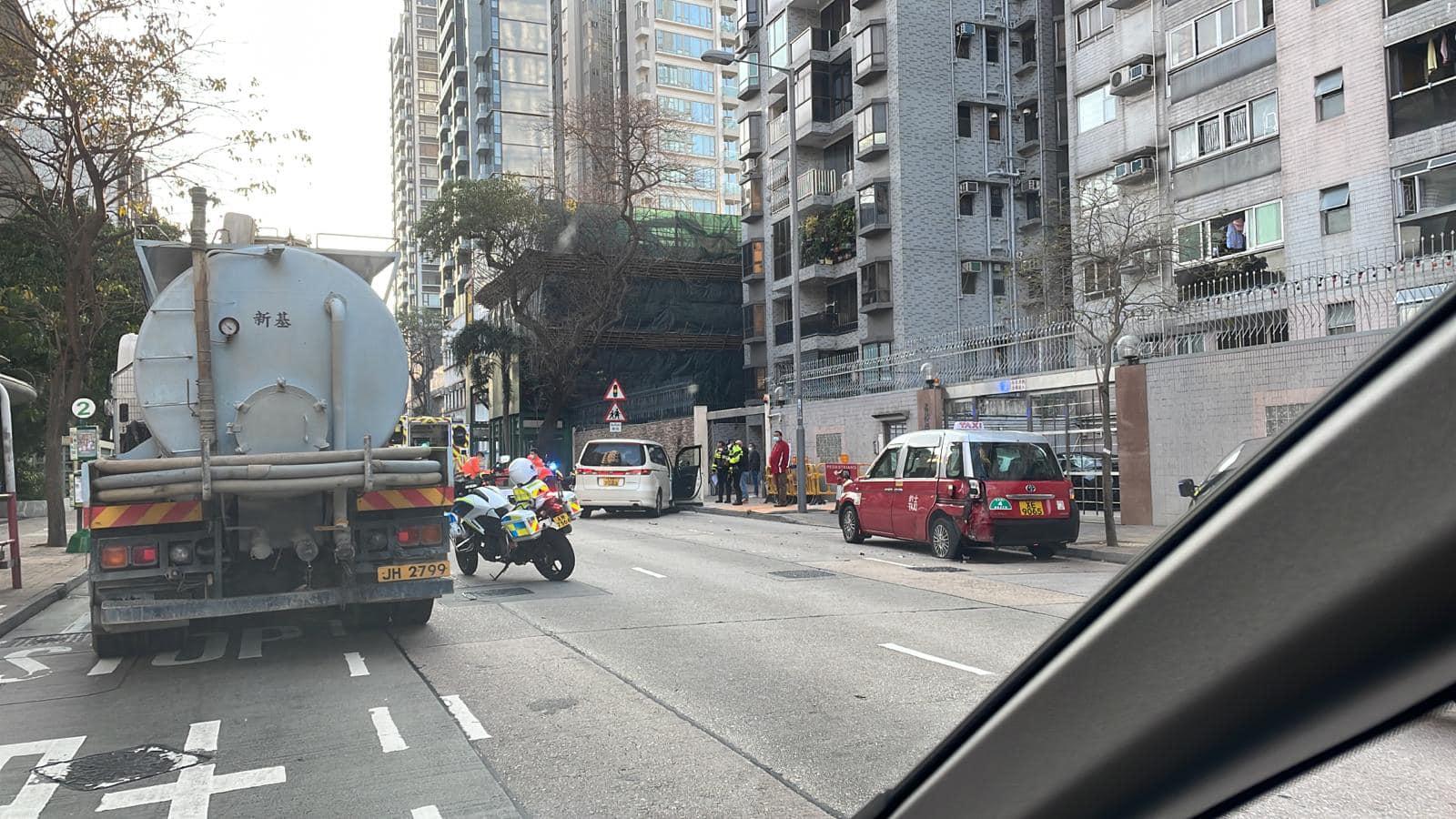 警方接報到場調查,現場可見電單車尾箱甩脫掉在路旁,配件四散;的士左車尾損毀;七人車車頭泵把甩脫。
