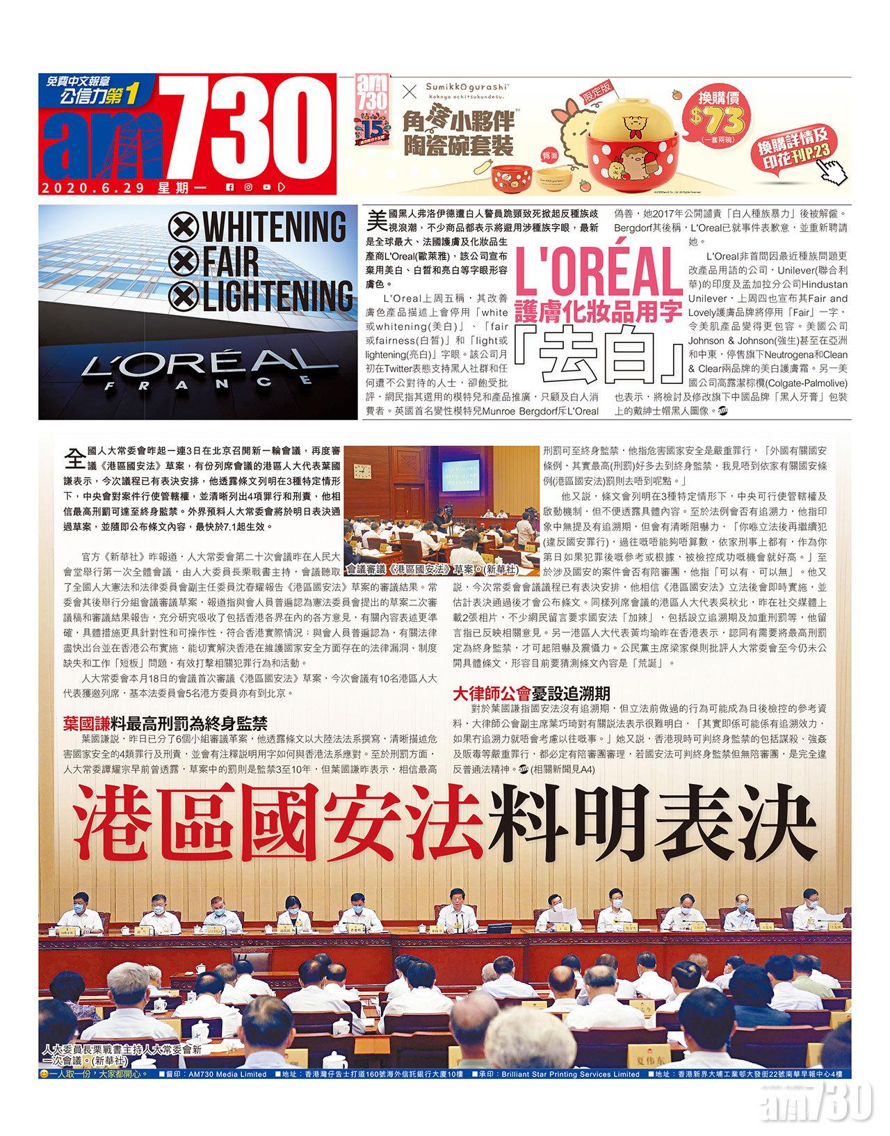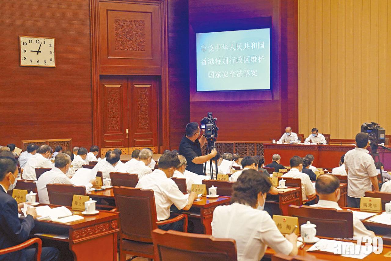 官方《新華社》昨報道,人大常委會第二十次會議昨在人民大會堂舉行第一次全體會議,由人大委員長栗戰書主持,會議聽取了全國人大憲法和法律委員會副主任委員沈春耀報告《港區國安法》草案的審議結果。常委會其後舉行分組會議審議草案,報道指與會人員普遍認為憲法委員會提出的草案二次審議稿和審議結果報告,充分研究吸收了包括香港各界在內的各方意見,有關內容表述更準確,具體措施更具針對性和可操作性,符合香港實際情況;與會人員普遍認為,有關法律盡快出台並在香港公布實施,能切實解決香港在維護國家安全方面存在的法律漏洞、制度缺失和工作「短板」問題,有效打擊相關犯罪行為和活動。