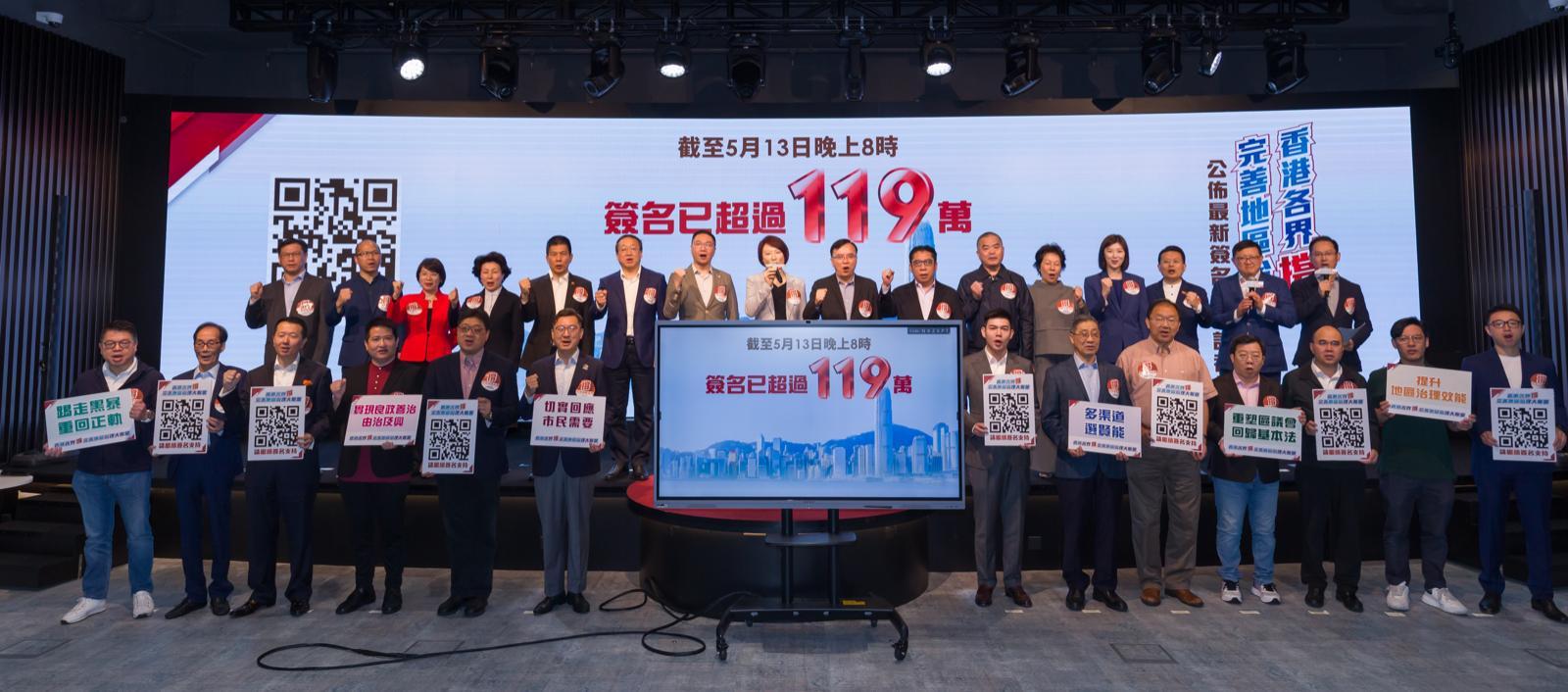 香港各界撐完善地區治理大聯盟今日(14日)召開記者會,大聯盟總召集人、民建聯主席李慧琼指,截至昨晚(13日)8時共收集到119萬個簽名,當中逾88萬個於街站收集、約30萬個在網上收集。她又稱,今早再次到過地區街站,有不少市民表示希望透過完善方案,令區議會重回正軌、真正做實事。