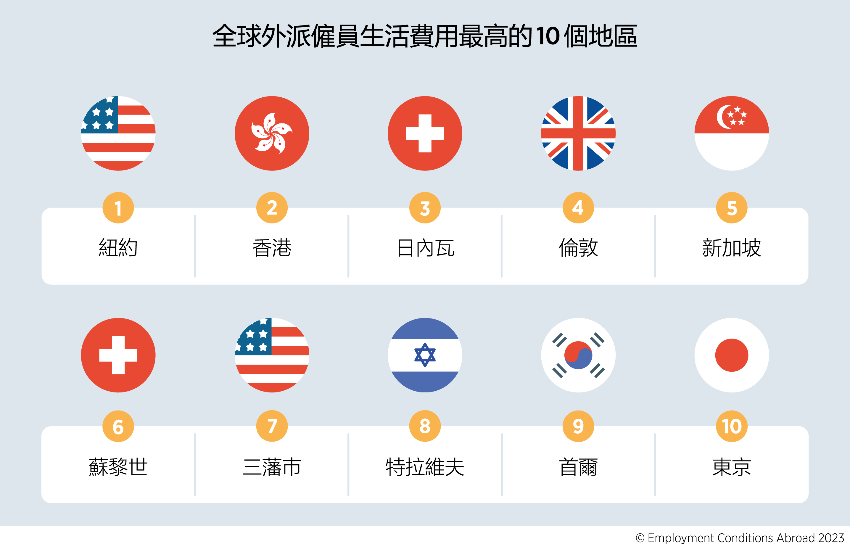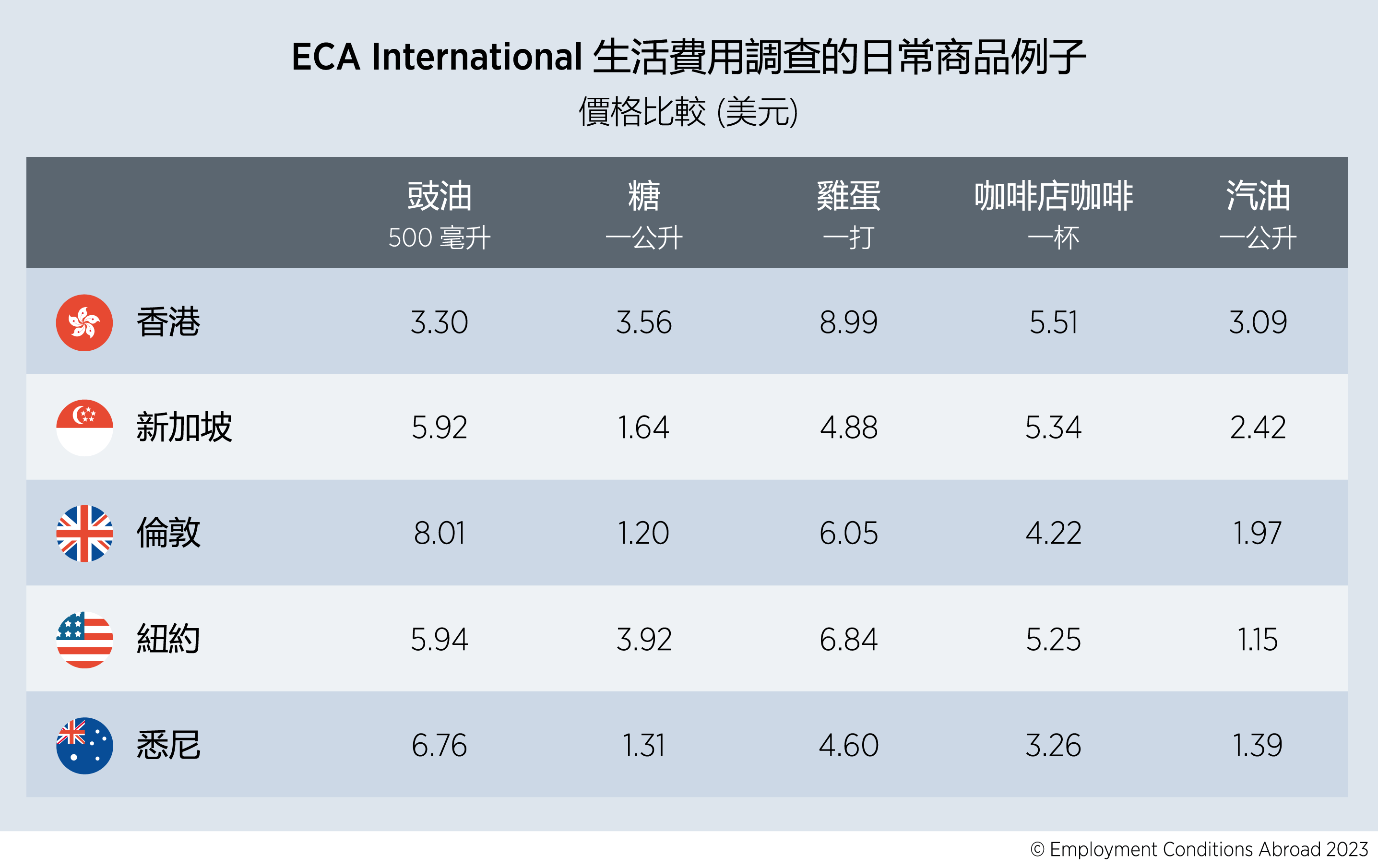 人力資源管理顧問機構ECA International發表最新「生活費用研究」, 結果顯示香港排名下降1位。機構指出,儘管本地通脹水平處於歷史高位,但因紐約物價上漲速度高於香港,同時香港的住屋租金持續下跌,令香港排名有場所下跌,結束連續4年位居榜首紀錄。