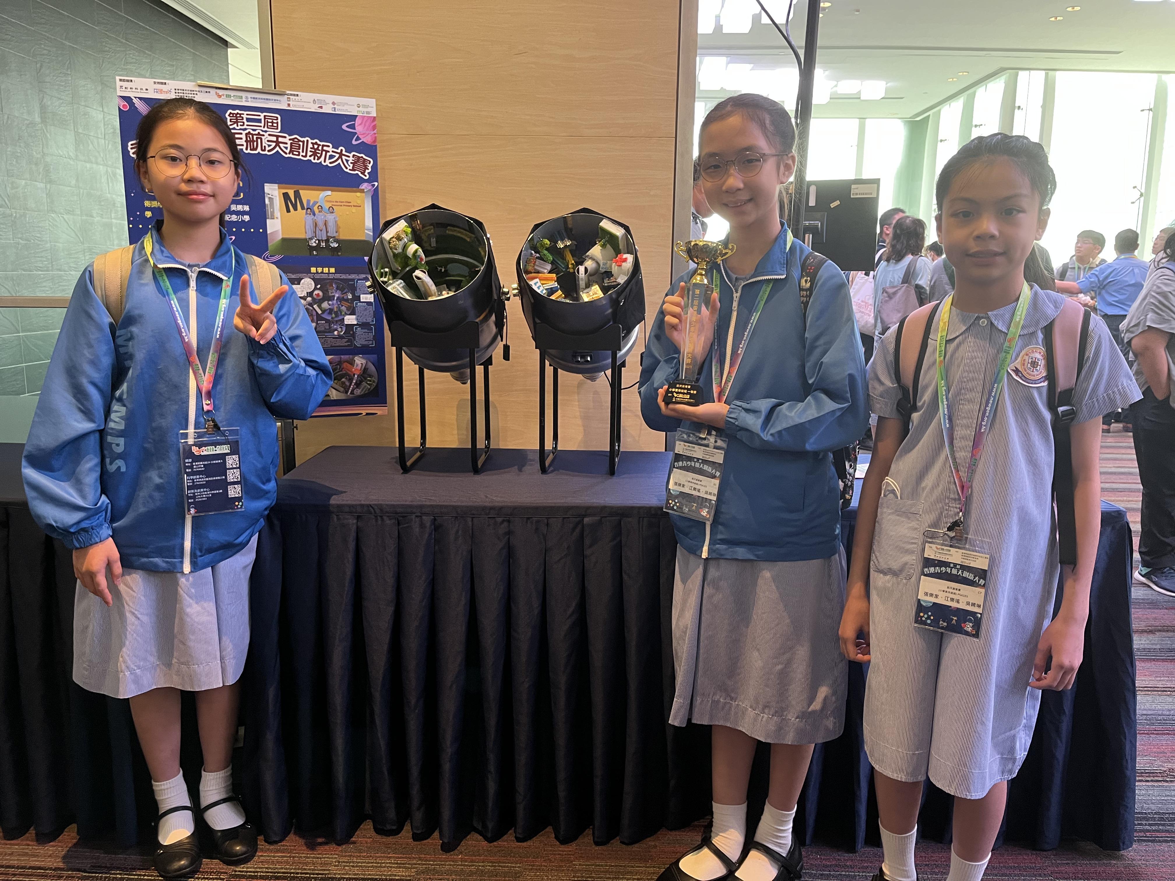 小學組方面,同樣經學校推薦參賽的高小學生江樂瑤、張樂家及吳晞琳對於能獲「航天創意賽(小學高年級組)」一等獎感到榮幸。她們表示,自己透過比賽學習到拉格朗日點、奧尼爾圓柱體、小行星採集水資源等航天知識,並將它們運用到未來太空城市模型「寰宇綠洲」的設計上,嘗試解決人類長時間居住太空所需面對的問題。江樂瑤希望未來能了解更多航天科技的相關知識、發掘更多宇宙奧秘,長遠於創新及科技業發展。