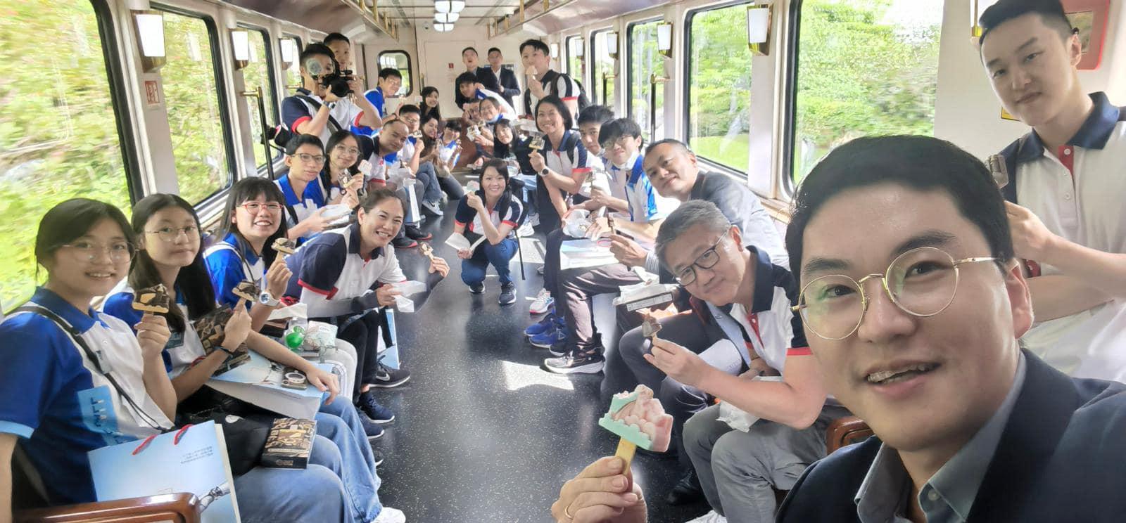 行程入面,團員乘搭咗貫通華為總部嘅交通工具,電動小火車,見到蕭澤頤同大家食雪條,好滋味咁呀。當然唔少得正經嘢嘅,團友話坐小火車遊覽總部內嘅歐洲小鎮園區期間,認識到小火車採用嘅華為先進快速充電技術,喺到站8至10秒嘅時間內充電,就足夠續航一公里以上。