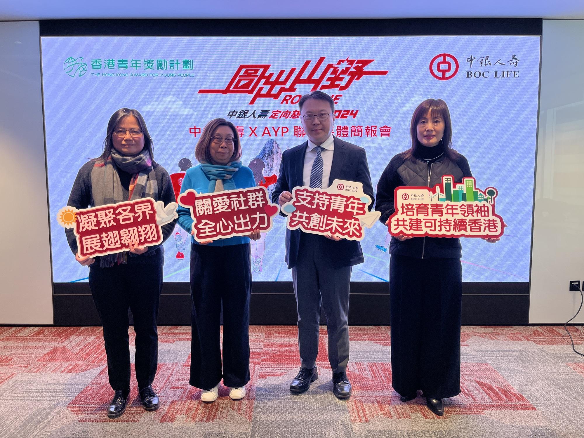 (左起)佛教何南金中學校長馬寶紅、香港青年獎勵計劃總幹事陳潔儀、中銀人壽執行總裁鄧子平、中銀人壽品牌及企業傳訊總監焦揚。(陳詠琳攝)
