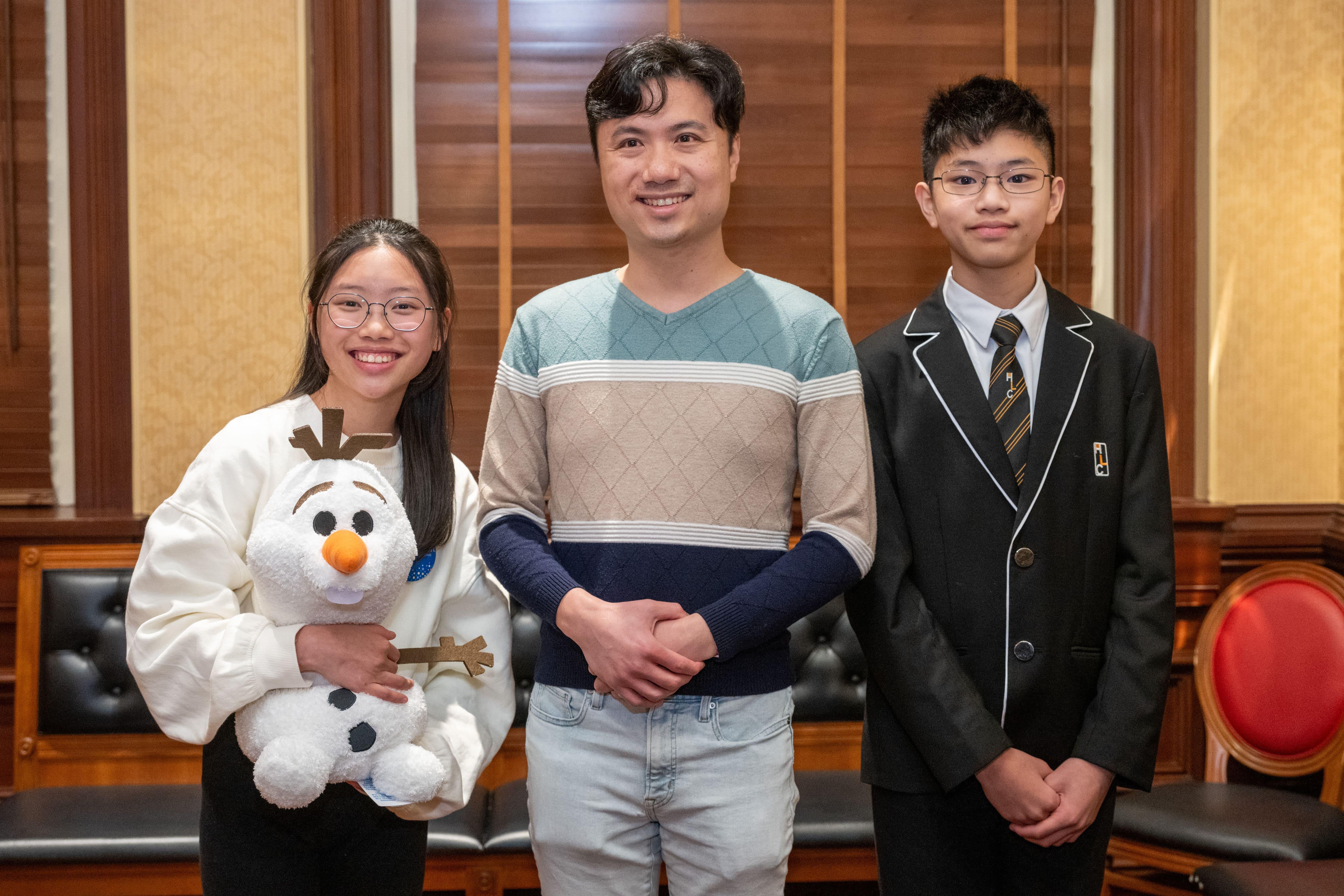 (左起)願望成真基金®️願望童葉焯楠(Bells)、香港展能藝術會藝術家李軒以及香港青年協會李兆基書院學生黃懷熙(Ray)立志成為鋼琴家,用音樂感染大眾。(陳奕釗攝)