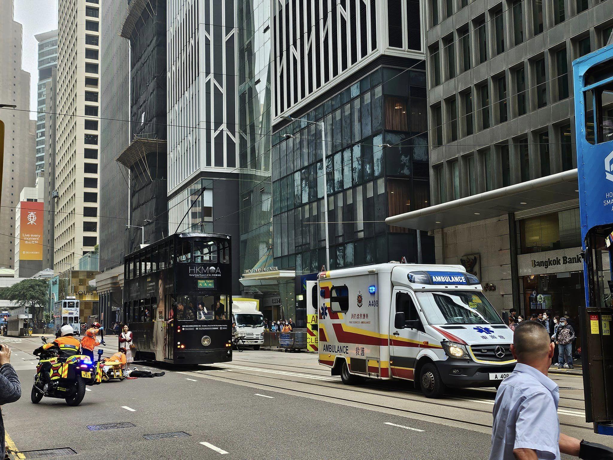中環女子過路遭電車撞倒,頭部重創送院。(fb「車cam L(香港群組)」圖片)