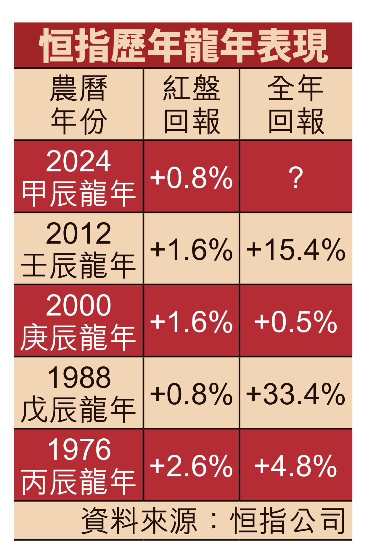按恒生指數公司統計數據,恒指自1969年11月推出以來,經歷5次龍年紅盤均高收,平均升1.5%;過去4次龍年的全年表現均錄正回報,平均漲13.5%,以1988年戊辰龍年增幅最亮麗,在紅盤走高0.8%後,全年亦大漲33.4%。另外,市場上一直有「紅盤效應」說法,意指紅盤表現可成為全年啟示,惟自1969年以來,農曆年首個交易日表現與全年表現方向一致的概率為54%。值得留意是,紅盤效應在過去10個農曆年失效8次,以過去3年為例,恒指皆錄紅盤高收,然而全年均告下跌;不過,龍年過去4次「紅盤效應」均應驗。