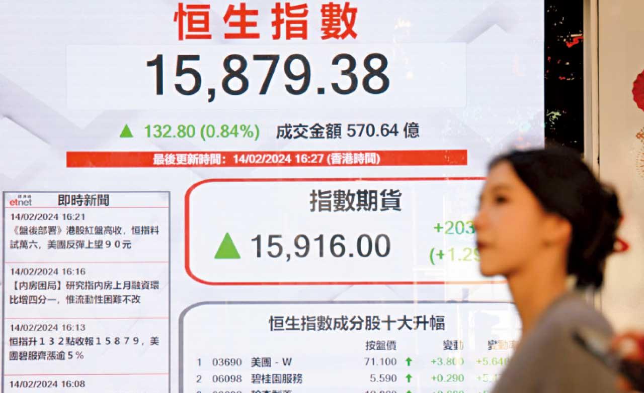 港股龍年紅盤保全升紀錄!美股隔晚大挫逾5百點,恒生指數在甲辰龍年首個交易日低開167點,最多曾挫290點,及後拗腰向上並倒升,收市高收132點或0.8%,報15,879點,力保歷年5個龍年紅盤均報升的紀錄,市場憧憬「紅盤效應」再一次在龍年應驗。不過分析認為短線仍要提防美股回吐拖累港股,指昨天錄得升市要「揞住半邊嘴笑」,並不排除萬六關或續受阻。