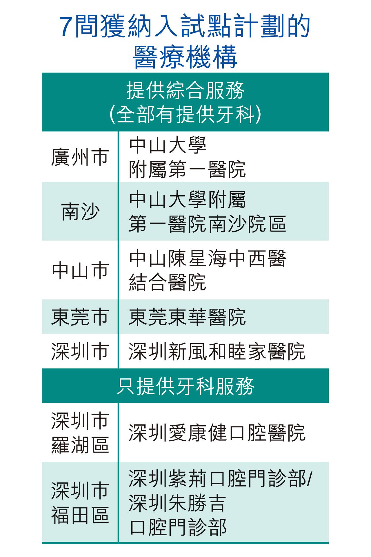 目前港人長者擬用醫療券在內地看病,只可到香港大學深圳醫院和該院設於深圳龍崗區的華為荔枝苑社區健康服務中心使用。第三季起再多5間綜合醫療機構(全部均有提供牙科服務),相關機構除深圳外,分別位於廣州、南沙、東莞和中山,以及兩間位於深圳牙科醫療機構。(附表)