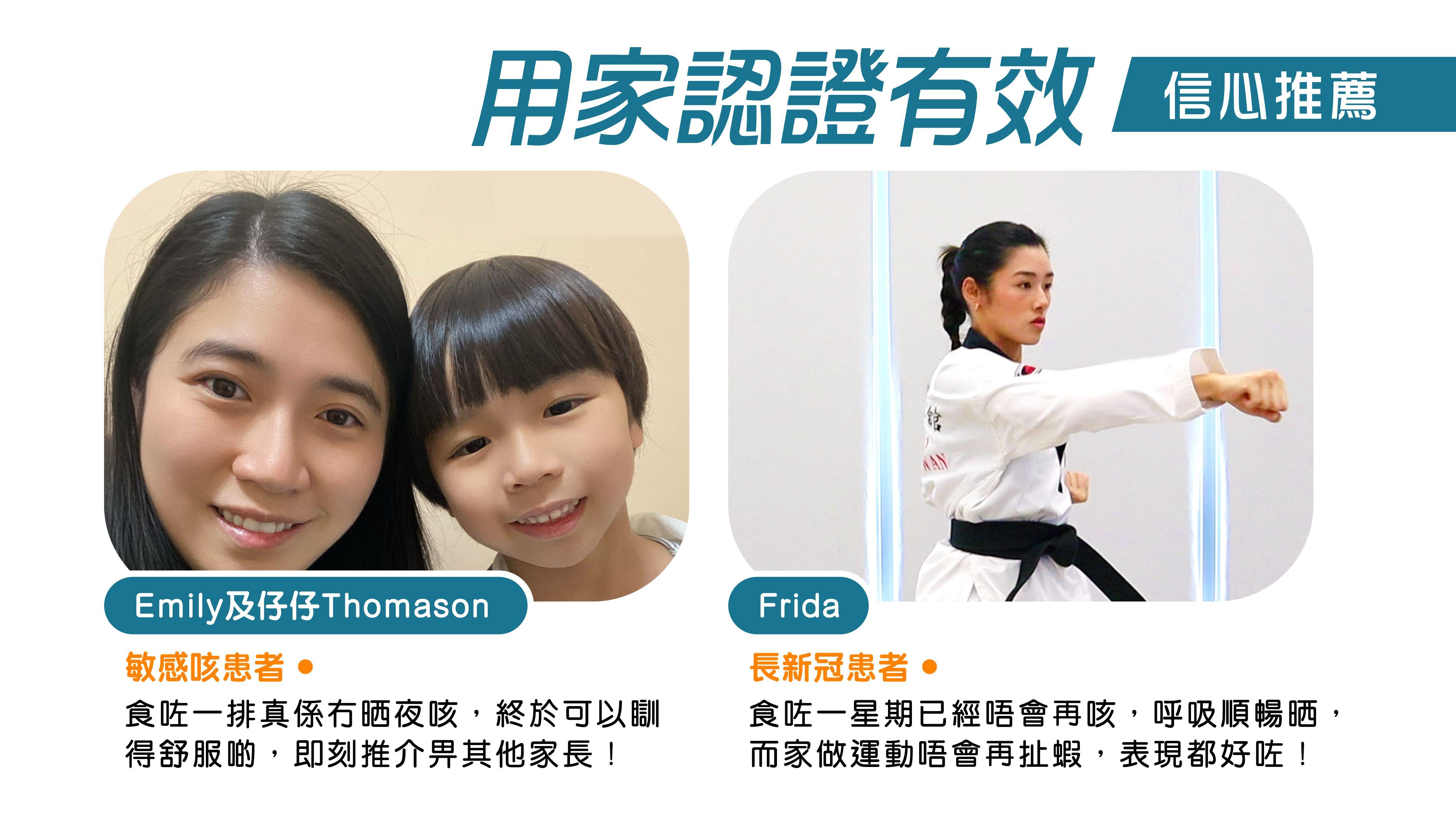 Emily的小朋友Thomason患有敏感咳,半夜經常咳醒,令Emily憂心不已。不過,服用正品鱷肺補後,Thomason咳嗽的次數逐漸減少,「真係冇晒夜咳,終於可以瞓得舒服啲」。其後她更把正品鱷肺補推介給其他有相同困擾的家長,「佢哋都話小朋友食完冇再咳,堅有效」。