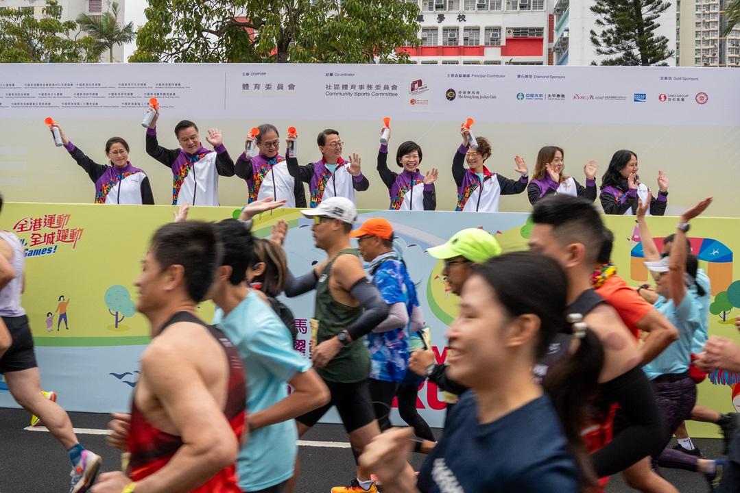 文化體育及旅遊局常任秘書長黃智祖、康樂及文化事務署(康文署)署長劉明光、第九屆港運會籌備委員會(籌委會)主席容樹恒教授、香港賽馬會慈善事務總經理(體育及公益慈善研究院)鄧詠茵、中國香港田徑總會義務司庫陳宛渝及康文署副署長(康樂事務)徐曉露親臨現場主持起跑儀式,見證巿民的運動熱情。