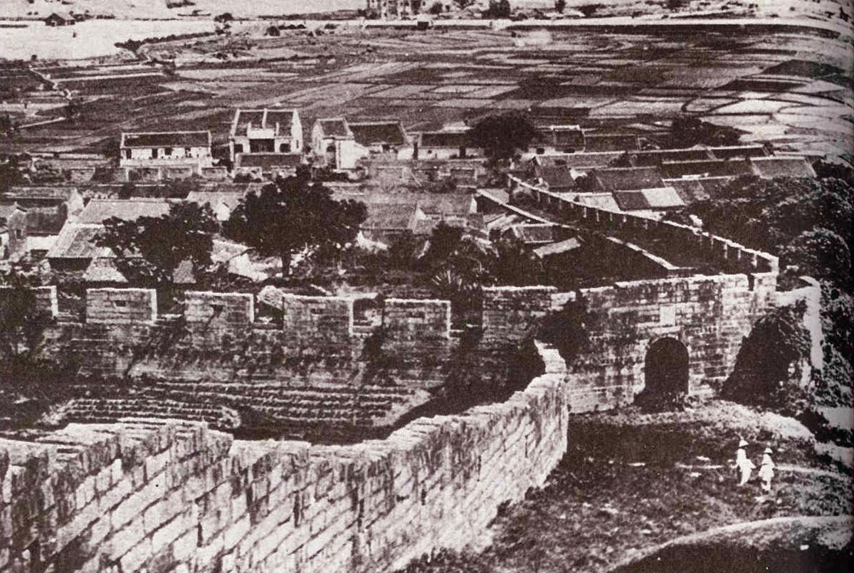 清末時期從白鶴山南望九龍寨城的情況。九龍寨是香港早期的兩個海防關城之一,早有清兵駐紮。(網上圖片)