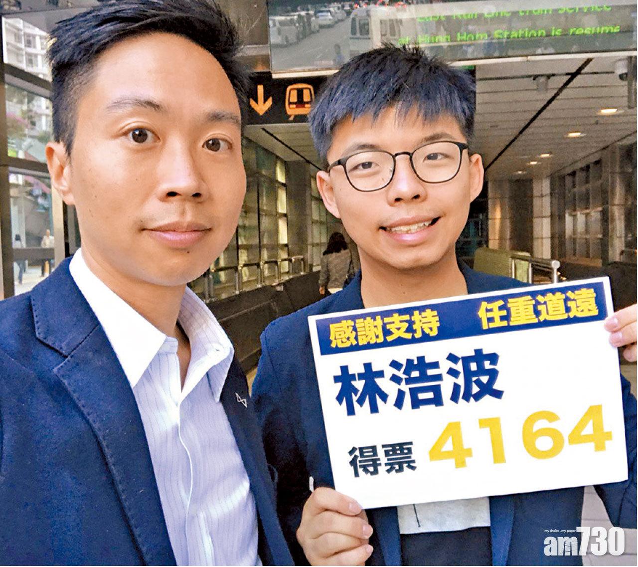 黃之鋒(右)昨陪同「Plan B」林浩波(左)到海怡西選區謝票。(林浩波FB)
