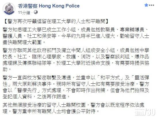 警方指,一直與校方緊密聯繫及溝通,並重申以「和平方式」及「靈活彈性」兩大原則解決事件。現時所有留守人士如有需要接受治療,警方會以「醫療先行」方式處理,不會即時作出拘捕,但會為他們拍照及登記個人資料,之後再作跟進。其他無須接受治療的留守人士離開校園,警方會以既定程序依法處理。警方重申所有離開人士均會獲公平對待。