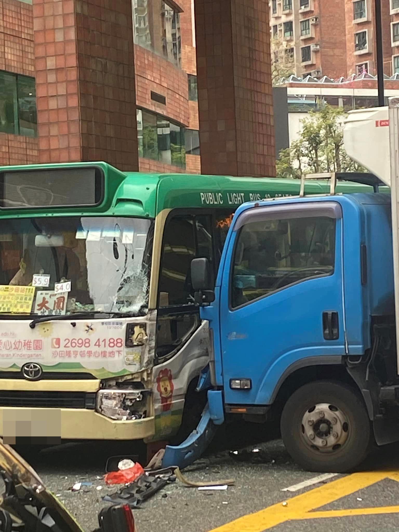 今日(5日)下午1時21分,一輛專線小巴沿沙田正街往大圍方向行駛,駛至偉華中心停車場出口對開時,遭一輛貨車攔腰直撼,小巴左邊車身嚴重損毀,玻璃雜物散滿一地。