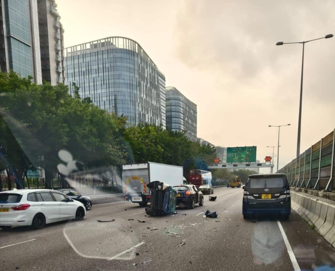 吐露港公路兩車相撞私家車翻側 女司機一度被困