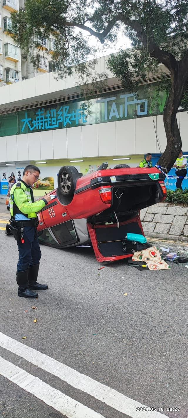 大埔今早(18日)有的士失事,四輪朝天,的士司機受輕傷。